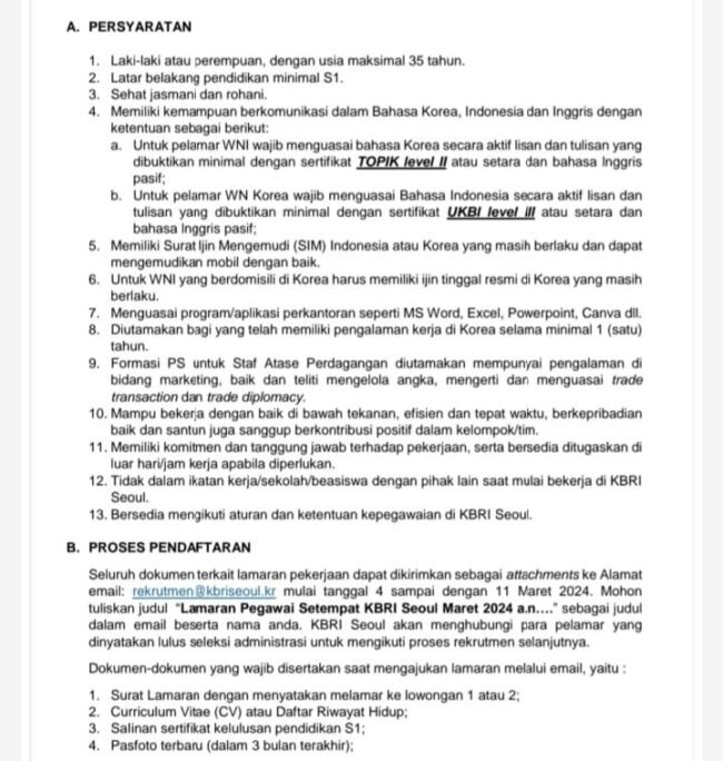 PRS – Kedutaan Besar Republik Indonesia di Seoul (KBRI Seoul) membuka peluang menarik bagi Warga Negara Indonesia (WNI) dan Warga Negara Korea Selatan (WN Korea Selatan) untuk bergabung sebagai Pegawai Setempat.